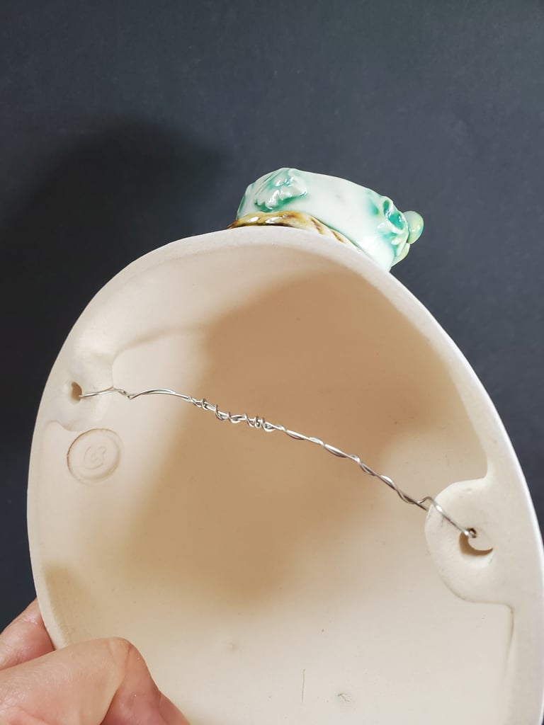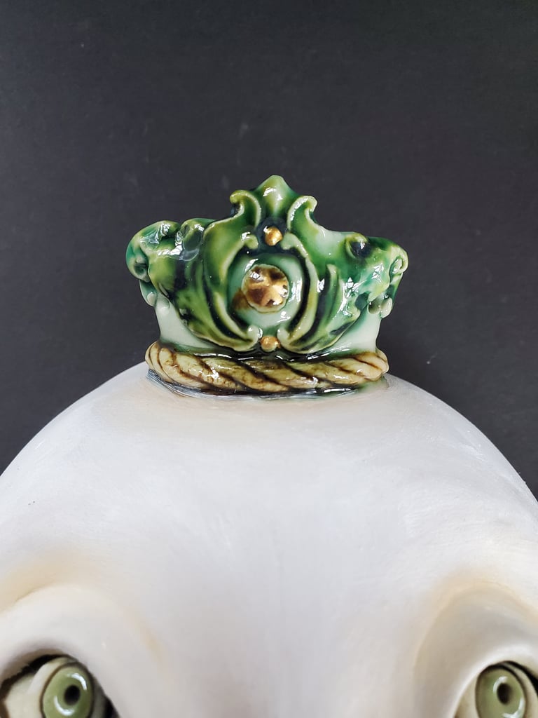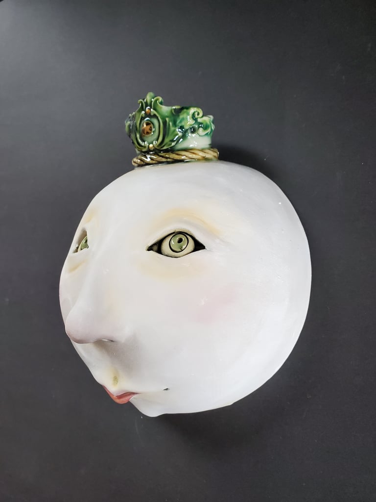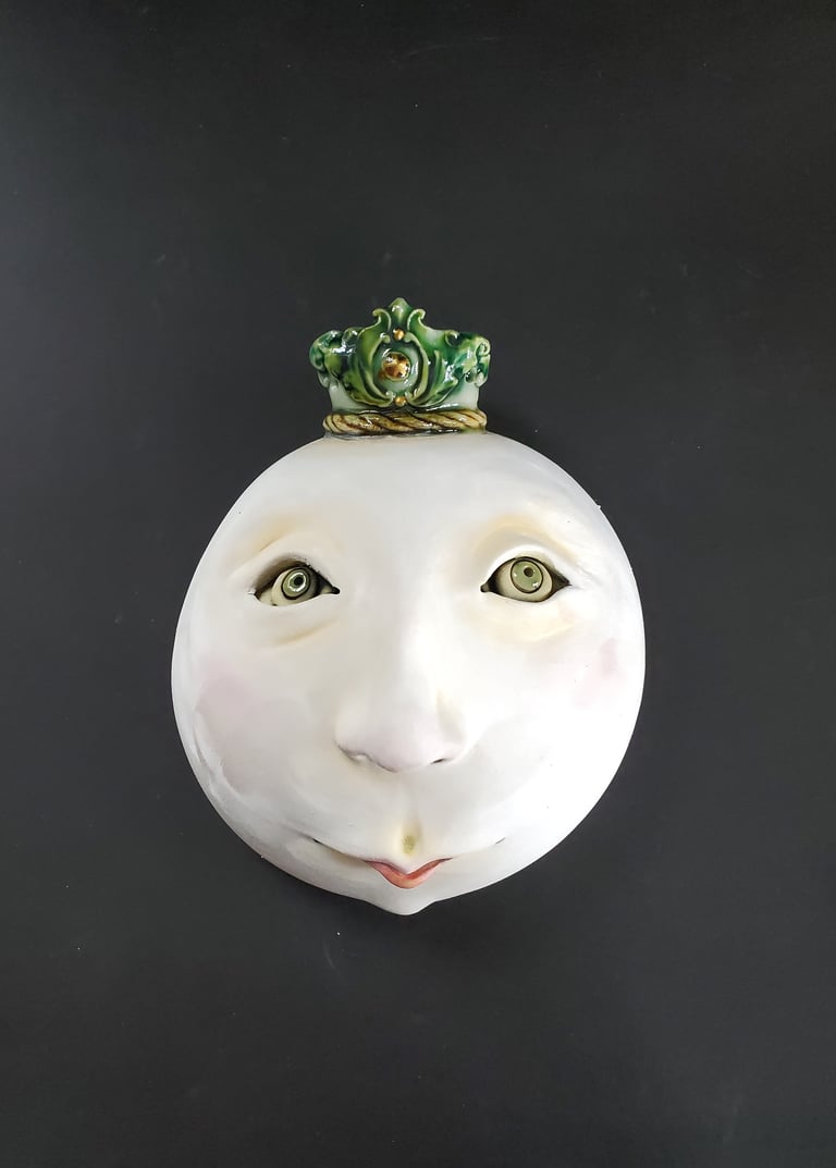 Wall-mounted round ceramic mask topped with a regal crown. The mask itself is approximately 14 cm in diameter, and the bejewelled headpiece adds around 5 cm to the height. Attaches to wall with a nail, hook or tack – see last photo. The mask is finished in cold glaze, so it is for indoor display only.
